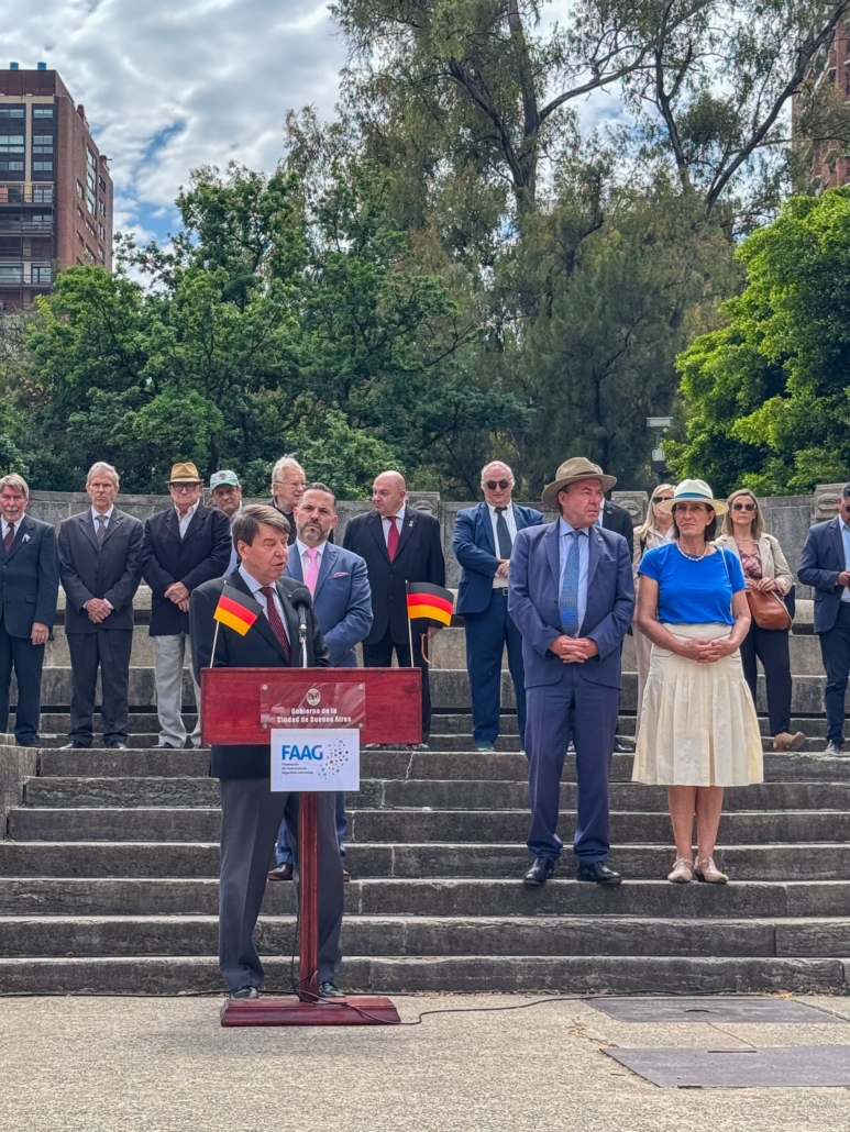 El Embajador de la República Federal de Alemania, Dr. Dieter Lamlé, y el presidente de FAAG, German Lehrke, ofrecieron mensajes alusivos a la efeméride y al bicentenario de la inmigración alemana en la Argentina. Como gesto simbólico de amistad entre ambos países, se plantó un jacarandá, iniciativa impulsada por la Congregación Evangélica Alemana de Buenos Aires.