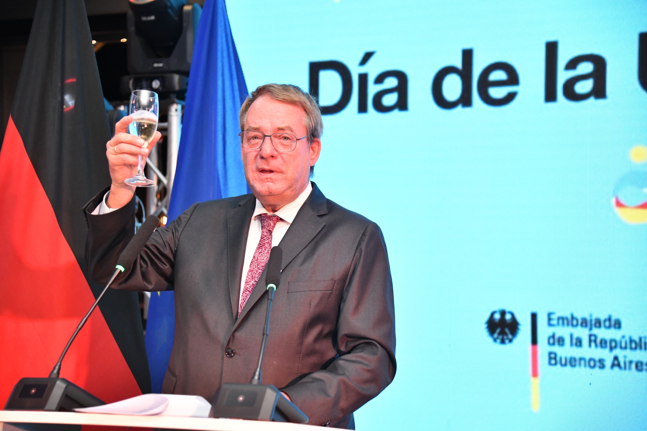 Estimado señor Embajador de la República Federal de Alemania, estimados representantes del Gobierno de la Ciudad Autónoma de Buenos Aires, estimados alumnos, miembros y amigos de la comunidad argentino – alemana. En nombre de la Federación de Asociaciones Argentino – Germanas les doy la bienvenida a este acto conmemorativo del 35 aniversario de la reunificación alemana. Agradecemos profundamente a la embajada de la República Federal de Alemania, a la firma Orbis Mertig, al director general de colectividades y migrantes, señor Santos Gastón Juan, a miembros de la Legislatura porteña, y a muchos voluntarios, por la colaboración prestada para la realización de este acto.
