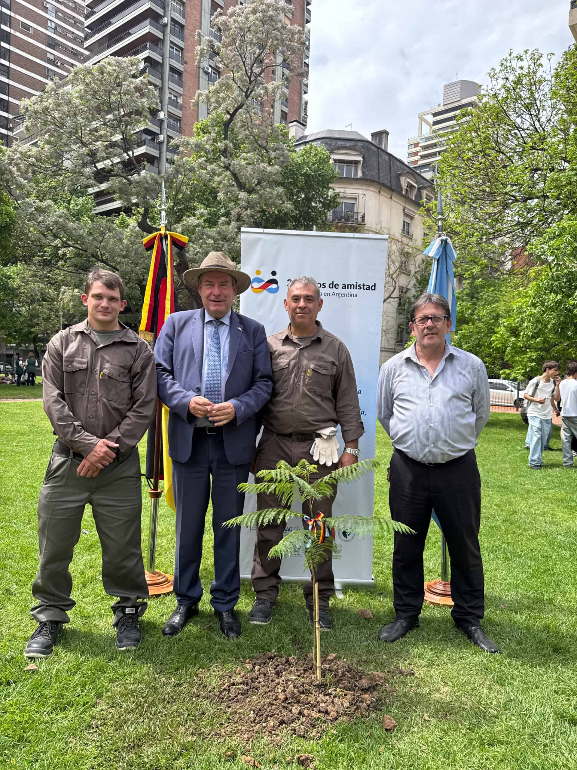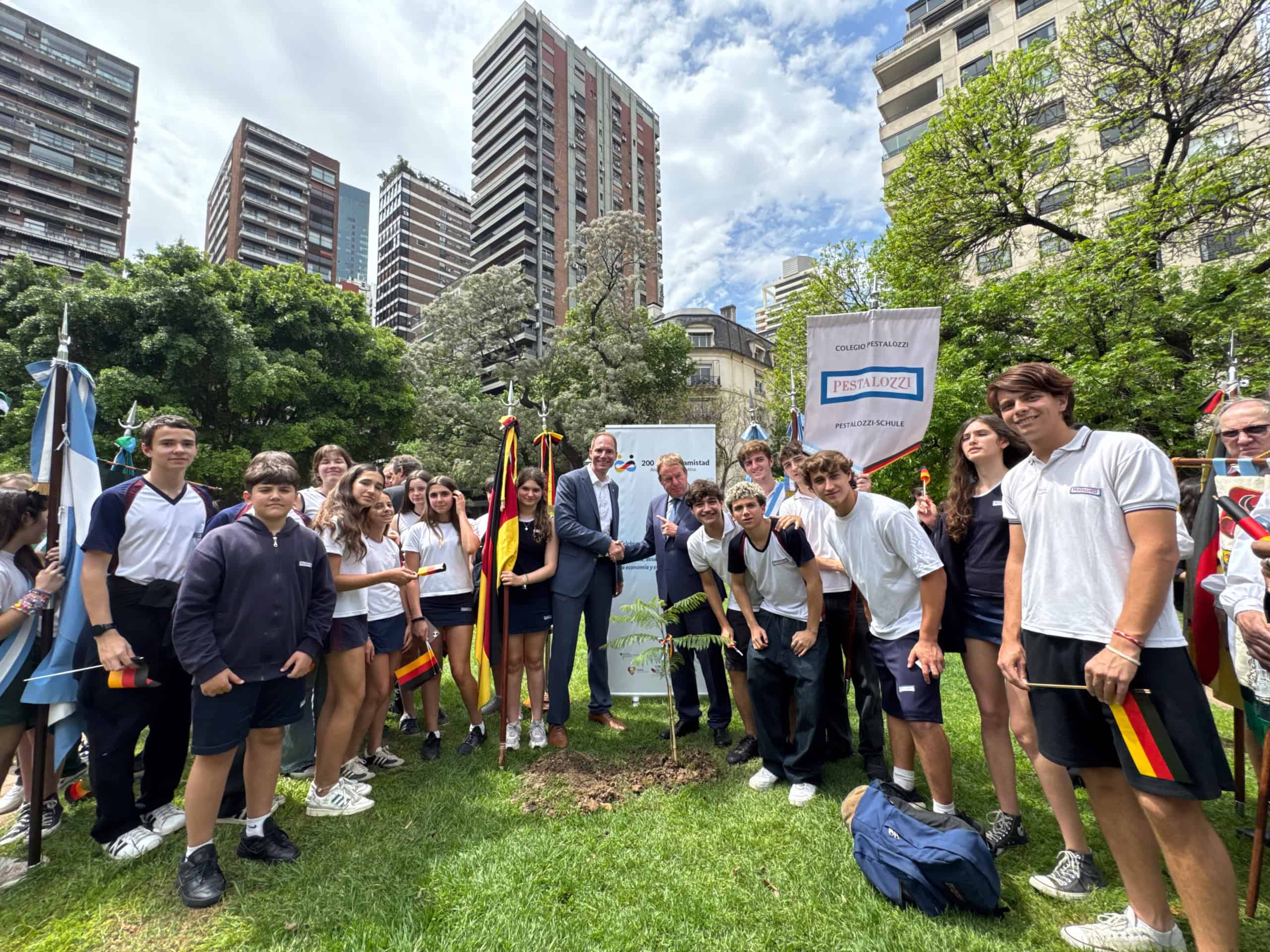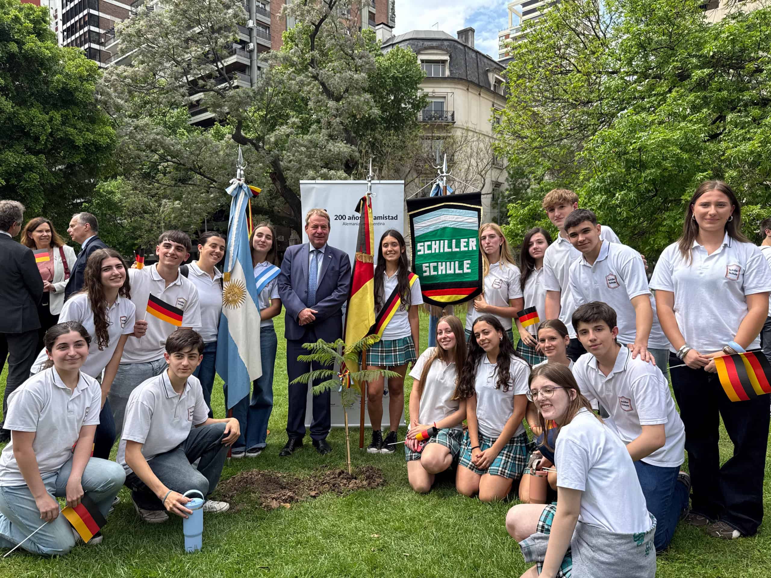 Y este año celebramos otro aniversario muy especial para nosotros: 200 años atrás llegaron a la Argentina los primeros grupos de inmigrantes alemanes, buscando un mejor porvenir. Aquí desarrollaron sus oficios y con el correr de los años crearon iglesias, escuelas, asociaciones culturales y deportiva, y empresas. Muchas de esas creaciones, ya centenarias, están activas hoy día, tales como la Congregación Evangélica Alemana, el Club Alemán en Buenos Aires, el Hospital Alemán, los colegios alemanes, y asociaciones culturales como las de Esperanza y Rosario, por dar algunos ejemplos. Todos ellos contribuyeron al desarrollo de la comunidad en la que se encuentran, echando profundas raíces en el suelo argentino, y proyectándose al futuro. Como muestra simbólica de la contribución de la inmigración alemana al desarrollo del país, hoy plantaremos un árbol en esta Plaza Alemania, quien con sus raíces represente el afincamiento en estas tierras, y con sus vigorosas ramas señale el futuro, la esperanza y las ganas de continuar contribuyendo al crecimiento de esta, nuestra nación argentina. Las raíces y el tronco representan las generaciones pasadas y presente, pero las ramas, que buscan brotar y crecer corresponden a la juventud, a las futuras generaciones que tripularán y dirigirán estas congregaciones, asociaciones, colegios, clubes y empresas, y que hoy están presentes aquí en esta plaza.